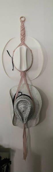 Display and store your favorite hats with this handmade macramé cowboy hat hanger. Designed to hold two hats, this stylish wall hanger adds a touch of western and boho décor while keeping your hats organized and protected. Carefully crafted with decorative knotwork and wooden rings, it’s a unique handmade piece perfect for ranch homes, western enthusiasts, or anyone who loves rustic décor. 2 Colours to choose from.