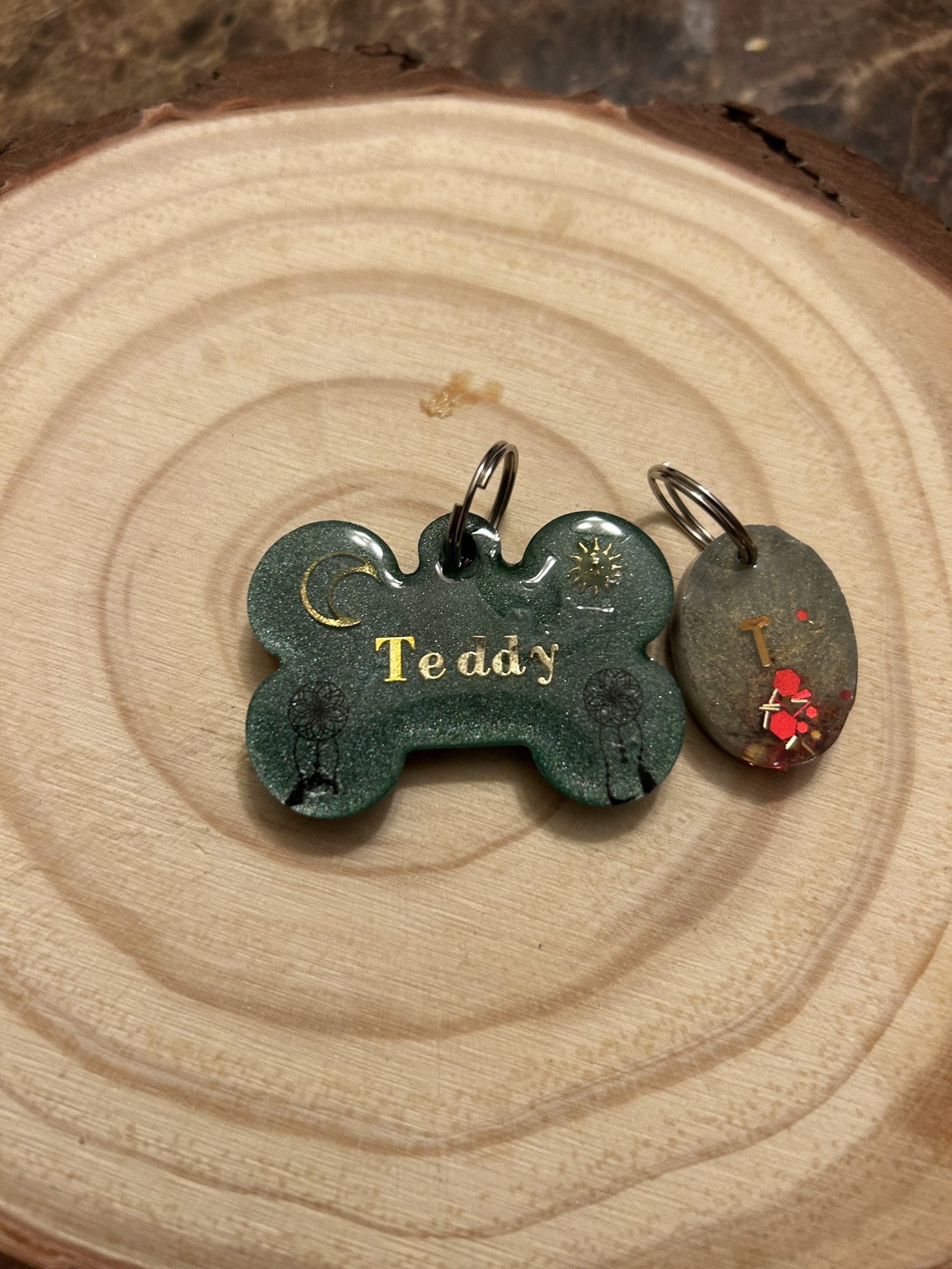 Our pretty handmade pet tags are sturdy and durable. Your pet name and phone number can be customized. Comes with free charms.